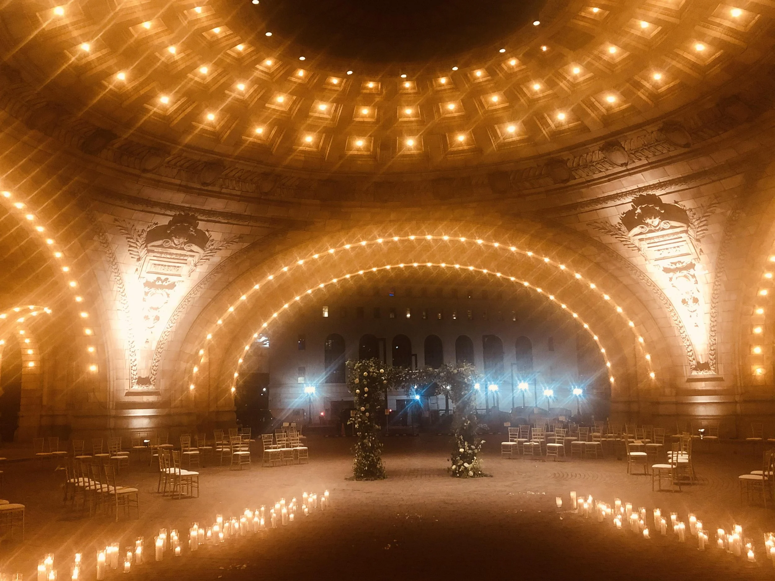 Beneath grand stone archways, hundreds of candles and fairy lights created a warm glow at this evening wedding. Occasional wild flowers "grew" from between cobblestone cracks with a chuppah constructed of lush greens.